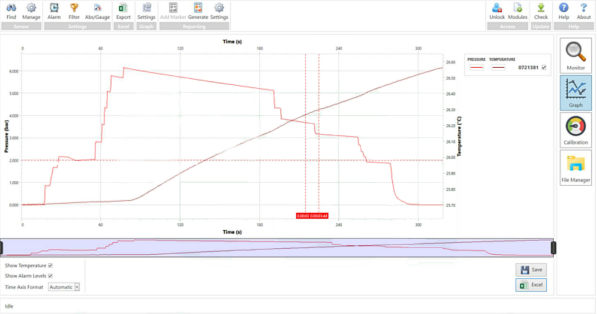 In addition to the pressure measurement, the temperature can also be read and recorded in the software, and scaled in either °C or °F.